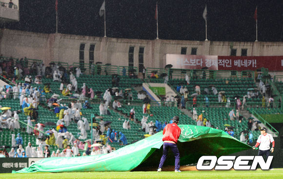 18일 오후 인천 문학경기장에서 '2013 한국야쿠르트 세븐 프로야구' SK 와이번스 대 롯데 자이언츠의 경기가 열렸다. 7회초 롯데 공격 무사 1, 2루 대타 김문호 타석, 롯데가 SK를 6-5 1점차로 리드하고 있는 가운데 많은 비로 인해 경기가 중단되고 있다.