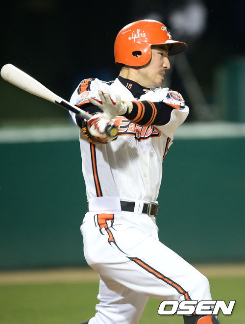 18일 오후 대전구장에서 열린 '2013 한국야쿠르트 세븐 프로야구' 한화 이글스와 두산 베어스의 경기, 8회말 무사 1,3루 한화 한상훈이 1타점 적시타를 때리고 있다.
