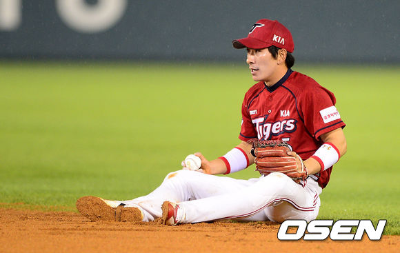 9회말 무사 2루에서 KIA 홍재호가 LG 문선재의 안타성 타구를 점프해 잡은뒤 넘어져 상황을 살피고 있다./jpnews@osen.co.kr