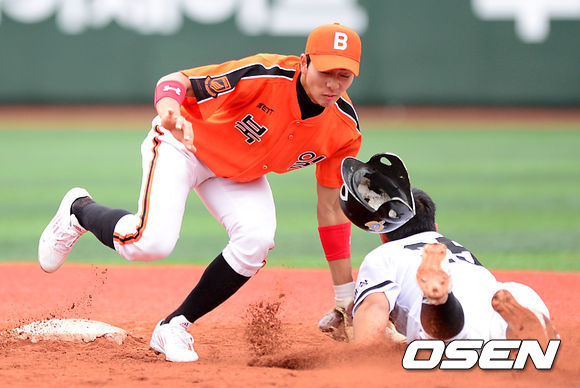 19일 오전 서울 목동야구장에서 '제67회 황금사자기 전국고교야구대회' 상원고와 북일고의 경기, 5회초 1사 1루에서 상원고 강대현 타석 때 1루주자 김동현이 도루에 실패하고 있다.