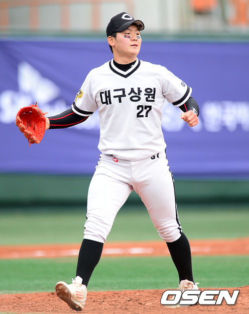 19일 오전 서울 목동야구장에서 '제67회 황금사자기 전국고교야구대회' 상원고와 북일고의 경기, 5회말 2사 만루에서 상원고 이수민이 북일고 송우현을 삼진으로 처리하고 환호하고 있다.