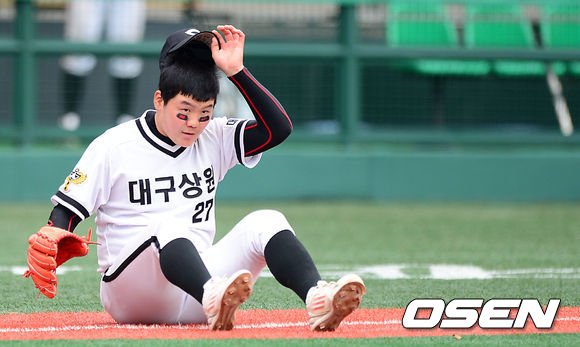 19일 오전 서울 목동야구장에서 '제67회 황금사자기 전국고교야구대회' 상원고와 북일고의 경기, 6회말 1사에서 북일고 최형서의 땅볼 타구를 잡아 송구하며 넘어진 상원고 이수민이 아쉬운 표정을 짓고 있다.