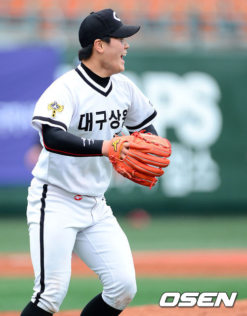 19일 오전 서울 목동야구장에서 '제67회 황금사자기 전국고교야구대회' 상원고와 북일고의 경기, 6회말 2사 2,3루에서 상원고 이수민이 북일고 노태형을 내야 땅볼로 처리하고 환호하고 있다.