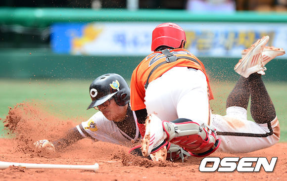 19일 오전 서울 목동야구장에서 '제67회 황금사자기 전국고교야구대회' 상원고와 북일고의 경기, 8회초 1사 1,2루에서 상원고 김도경의 번트 때 홈으로 쇄도한 2루루자 강대현이 북일고 포수 최형서에 의해 태그아웃 되고 있다.