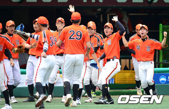 19일 오전 서울 목동야구장에서 '제67회 황금사자기 전국고교야구대회' 상원고와 북일고의 경기, 8회초 1사 1,2루에서 상원고 김도경의 번트 때 홈으로 쇄도한 2루루자 강대현을 태그아웃 처리한 북일고 선수들이 환호하고 있다.