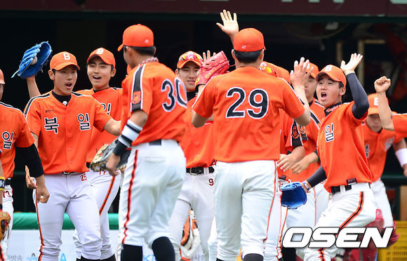 19일 오전 서울 목동야구장에서 '제67회 황금사자기 전국고교야구대회' 상원고와 북일고의 경기, 8회초 1사 1,2루에서 상원고 김도경의 번트 때 홈으로 쇄도한 2루루자 강대현을 태그아웃 처리한 북일고 선수들이 환호하고 있다.