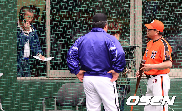 19일 오전 서울 목동야구장에서 '제67회 황금사자기 전국고교야구대회' 상원고와 북일고의 경기, 8회말 1사에서 상원고 박영진 감독이 북일고 선수의 배트가 공인 배트가 아니라는 문제를 제기하자 관계자가 확인하고 있다.