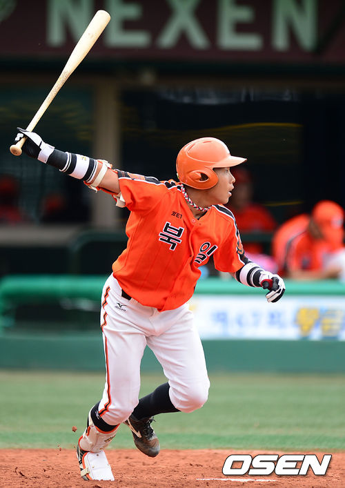 19일 오후 서울 목동야구장에서 '제67회 황금사자기 전국고교야구대회' 상원고와 북일고의 경기, 10회말 승부치기에서 북일고 송우현이 끝내기 희생플라이를 치고 있다.