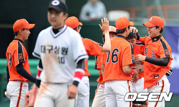 19일 오후 서울 목동야구장에서 '제67회 황금사자기 전국고교야구대회' 상원고와 북일고의 경기, 경기 종료 후 북일고 선수들이 승리의 기쁨을 나누고 있다.