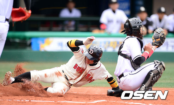 19일 오후 서울 목동야구장에서 '제67회 황금사자기 전국고교야구대회' 덕수고와 광주일고의 경기, 1회초 무사 3루에서 덕수고 김하민의 희생플라이 때 3루주자 조평안이 홈을 밟고 있다.