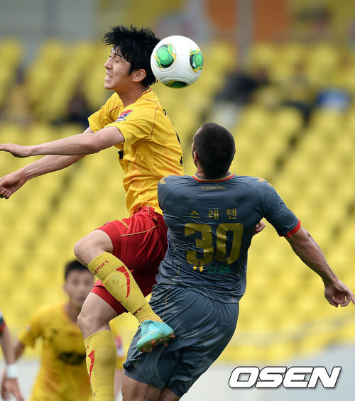19일 오후 성남 탄천종합운동장에서 열린 '현대오일뱅크 K리그 클래식' 성남 일화와 경남 FC의 경기 전반 성남 김동섭과 경남 스레텐이 헤딩 경합을 벌이고 있다.
