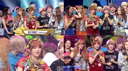 이날 포미닛은 MC들이 1위를 호명한 후에도 한참동안 놀란 표정을 지어보이면 자신들의 1위를 실감하지 못하는 모습을 보였다. 이어 멤버들은 홍승성 대표를 비롯해 큐브엔터테인먼트 소속사 관계자들의 이름을 하나하나 호명하며 고마움을 전했다.