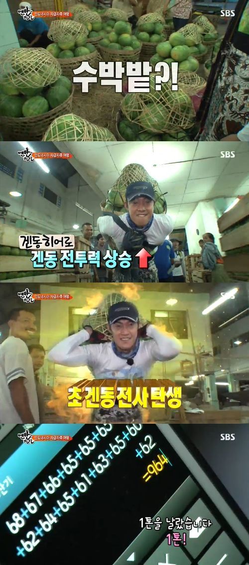 무려 70kg 가까이 되는 겐동을 무려 15번이나 나르는 상황에 처했다. 김현중은 당황해 했지만 짐을 나르기 시작했고 결국 모든 수박을 옮겼다. 결과적으로 김현중은 무려 1톤 가까이 되는 수박을 나른 것.