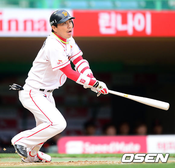 19일 오후 인천 문학야구장에서 열린 '2013 한국야쿠르트 세븐 프로야구' SK 와이번스와 롯데 자이언츠의 경기, 1회말 1사에서 SK 김강민이 우전 안타를 치고 있다.
