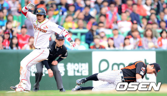 19일 오후 인천 문학야구장에서 열린 '2013 한국야쿠르트 세븐 프로야구' SK 와이번스와 롯데 자이언츠의 경기, 1회말 1사에서 SK 김강민이 우전 안타를 치고 3루에서 세이프 되고 있다.