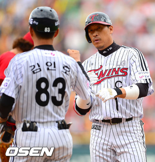 19일 오후 서울 잠실구장에서 열린 '2013 한국야쿠르트 세븐 프로야구' LG 트윈스와 KIA 타이거즈의 경기, 1회말 2사 1,3루 LG 이병규가 선취 1타점 적시타를 날리고 손인호 코치와 하이파이브를 하고 있다