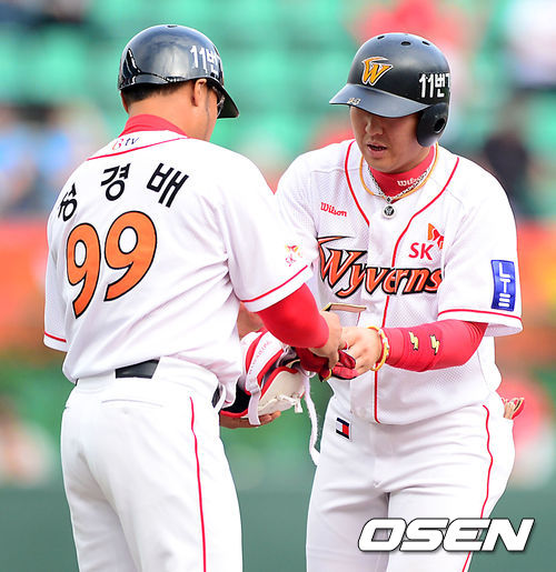 19일 오후 인천 문학야구장에서 열린 '2013 한국야쿠르트 세븐 프로야구' SK 와이번스와 롯데 자이언츠의 경기, 1회말 1사 3루에서 SK 최정이 좌전 적시타를 치고 정경배 코치와 이야기를 나누고 있다.