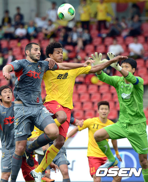 19일 오후 성남 탄천종합운동장에서 열린 '현대오일뱅크 K리그 클래식' 성남 일화와 경남 FC의 경기 후반 경남 스르텐이 헤딩슛을 시도하고 있다.