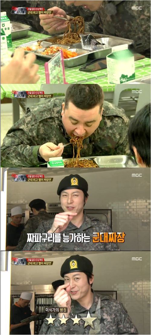 이날 멤버들은 꿀맛 같은 ‘군대짜장’을 말없이 먹었다. 음식을 싹싹 비운 후 서경석은 “10년 전 군대에서 먹었을 때보다 면발이 쫄깃하다”고 만족감을 표현했다. 류수영은 “‘아빠어디가’에 나왔던 ‘짜파구리’보다 낫다”고 미소를 지었다. ‘짜파구리’는 김성주가 짜장라면인 ‘짜파게티’와 두꺼운 면발의 ‘너구리’를 섞어 만든 요리다.