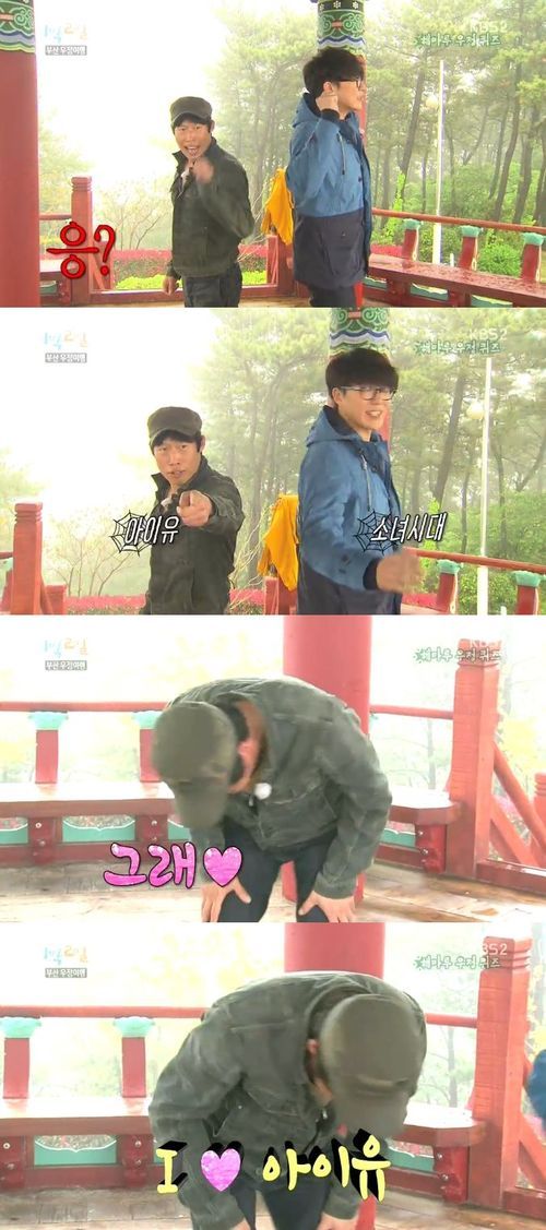 유해진은 19일 오후 방송된 '해피선데이-1박2일 시즌2'(이하 '1박2일')에서 성시경과 함께 해모루에 올라 서로에 대한 이심전심 퀴즈 풀기를 풀던 중 아이유와 소녀시대 중 한 팀을 고르는 질문에 "아이유"라 망설임 없이 답해 웃음을 자아냈다.