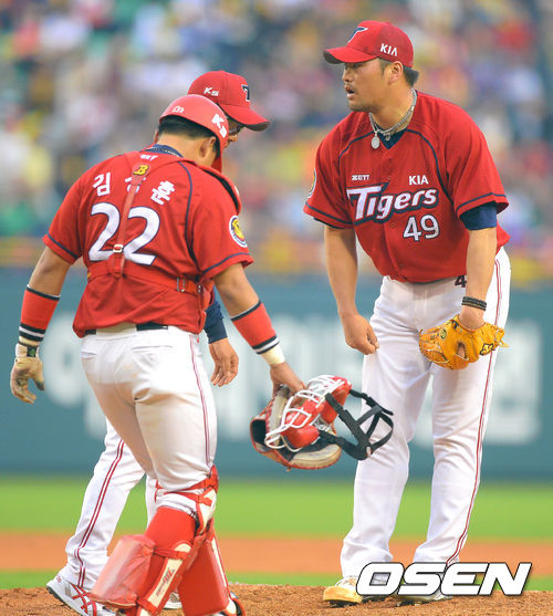 19일 오후 서울 잠실구장에서 열린 '2013 한국야쿠르트 세븐 프로야구' LG 트윈스와 KIA 타이거즈의 경기 5회말 KIA 선발투수 김진우가 연속안타를 허용한 후 조규제 코치와 이야기를 나누고 있다