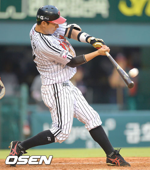 19일 오후 서울 잠실구장에서 열린 '2013 한국야쿠르트 세븐 프로야구' LG 트윈스와 KIA 타이거즈의 경기 5회말 2사 만루 LG 손주인이 3타점 적시타를 날리고 있다