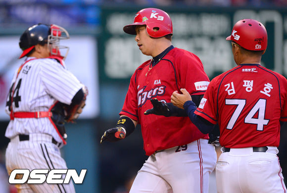 19일 오후 서울 잠실구장에서 열린 '2013 한국야쿠르트 세븐 프로야구' LG 트윈스와 KIA 타이거즈의 경기 6회초 1사 1루 KIA 나지완이 2점 홈런을 날리고 김평호 코치와 하이파이브를 하고 있다