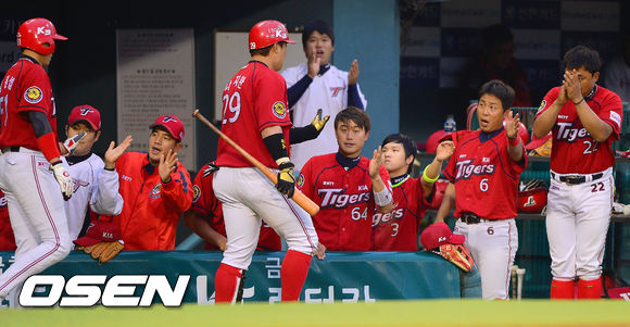 19일 오후 서울 잠실구장에서 열린 '2013 한국야쿠르트 세븐 프로야구' LG 트윈스와 KIA 타이거즈의 경기 6회초 1사 1루 KIA 나지완이 2점 홈런을 날리고 동료들과 하이파이브를 하고 있다