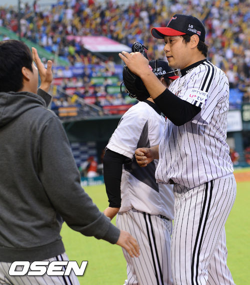 19일 오후 서울 잠실구장에서 열린 '2013 한국야쿠르트 세븐 프로야구' LG 트윈스와 KIA 타이거즈의 경기 6회초 KIA 나지완에게 2점 홈런을 허용한 LG 선발투수 류제국이 교체되고 있다. 류제국은 이날 5⅓이닝 피홈런 2개 포항 4실점 기록했다.