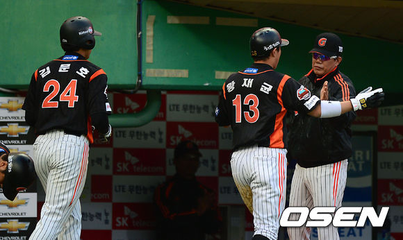19일 오후 인천 문학야구장에서 열린 '2013 한국야쿠르트 세븐 프로야구' SK 와이번스와 롯데 자이언츠의 경기, 7회초 2사 만루에서 롯데 손아섭의 2타점 적시타 떄 홈을 밟은 2루주자 황재균과 3루주자 김문호가 덕아웃에서 김시진 감독과 하이파이브를 하고 있다.