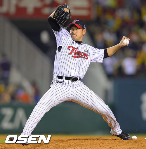 19일 오후 서울 잠실구장에서 열린 '2013 한국야쿠르트 세븐 프로야구' LG 트윈스와 KIA 타이거즈의 경기 8회초 2사 LG 봉중근 마무리 투수가 역투하고 있다