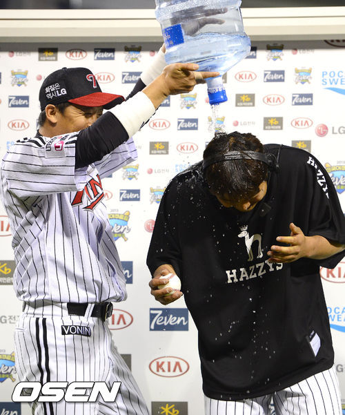 경기종료 후 승리투수가 된 LG 류제국이 이병규의 물세례를 받고 있다./ soul1014@osen.co.kr
