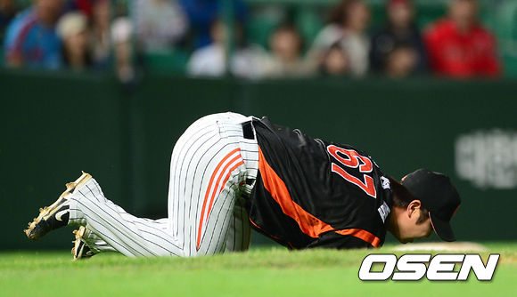 19일 오후 인천 문학야구장에서 열린 '2013 한국야쿠르트 세븐 프로야구' SK 와이번스와 롯데 자이언츠의 경기, 9회말 무사 2,3루에서 SK 정상호의 땅볼 타구를 잡으려 몸을 날린 롯데 김성배가 그라운드에 누워 고통스러워하고 있다.