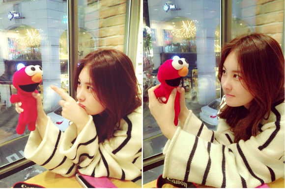 사진 속 손은서는 한 카페에 앉아 빨간색 인형을 든 채 깜찍한 표정을 짓고 있다. 인형을 훈계하는 듯한 모습을 설정한 모습이 귀여움을 자아낸다.
