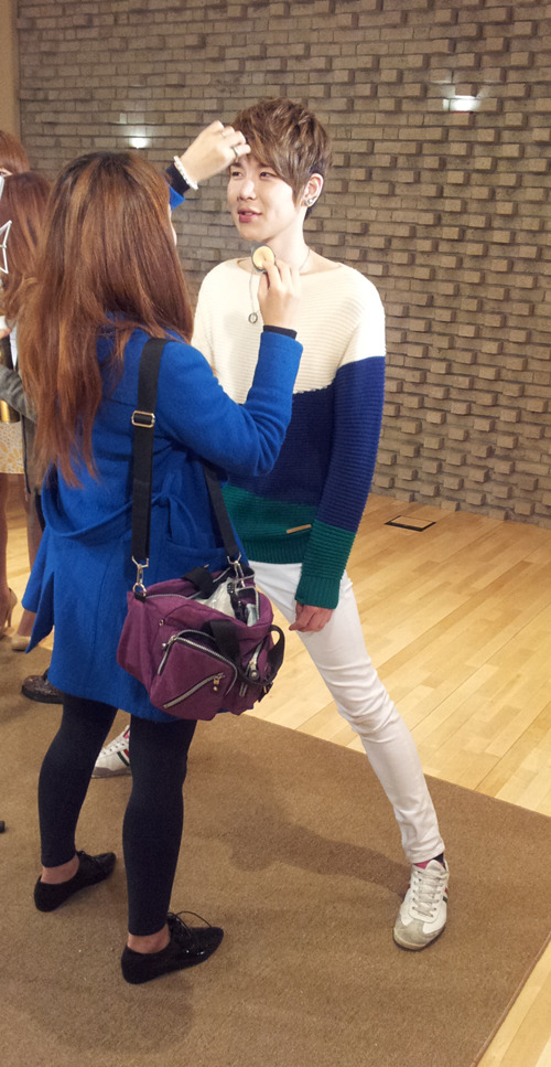 한별은 20일 소속사 측이 공개한 한 사진을 통해 긴 다리와 배려심을 동시에 선보였다. 메이크업을 받고 있는 한별은 키가 작은 여성 스태프를 위해 다리를 벌려 키를 맞춰주고 있다.