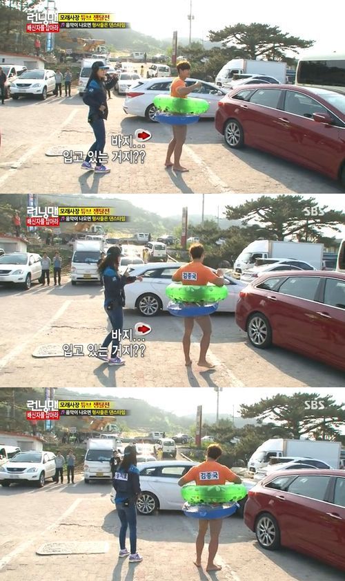 게임의 달인 김종국은 미션을 듣자마자 튜브를 몸에 끼는 방식으로 노림수를 던졌고 엄정화의 흥겨운 히트곡에 맞춰 댄스 파티까지 벌였던 것. 순간 김종국은 허리에 낀 튜브가 몇장 겹치면서 타이트한 살색 바지가 가려지면서 마치 하의 실종에 튜브만 걸친듯한 장면을 연출했다.