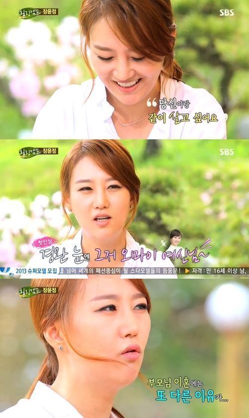 이날 장윤정은 항간을 떠들썩하게 만들었던 부모님 이혼소송과 억대 빚에 대해 먼저 설명했다. 10년간 모은 돈을 모두 잃고 현재는 억대 빚이 남아있는 상황이었지만 장윤정은 씩씩했다. 그는 어렸을 때부터 돈을 벌어야했던 사정을 설명하며 "탓한다고 해결되는 일이 아니고 표현도 잘 할 줄 모른다"고 말했다. 그는 경제상황과 가족사에 대해 털어놓으면서도 눈물을 보이지 않을만큼 강했다.