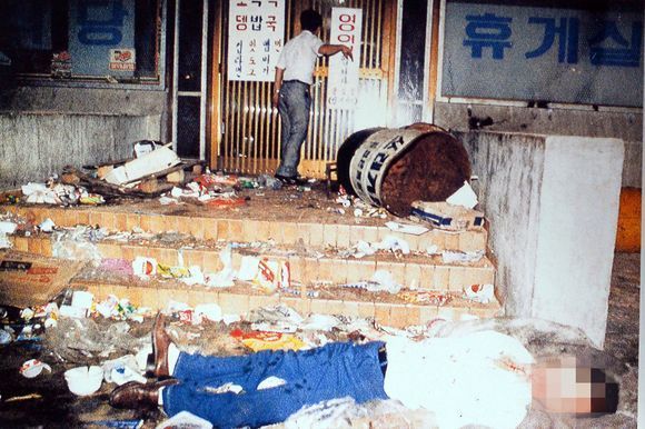 관중 난동의 와중에 사직구장 앞에서 피를 흘리며 쓰러져 있는 한 관중의 모습(일간스포츠 제공)
