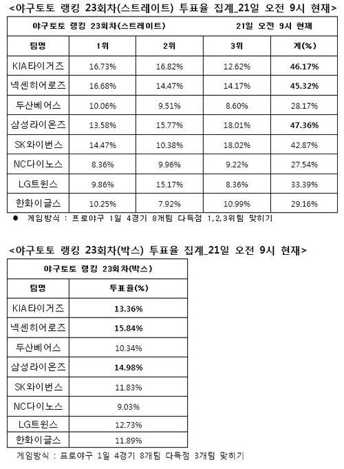 한편, 이번 야구토토 랭킹 23회차 게임은 경기시작 10분전인 22일(수) 오후 6시 20분에 발매가 마감된다.(