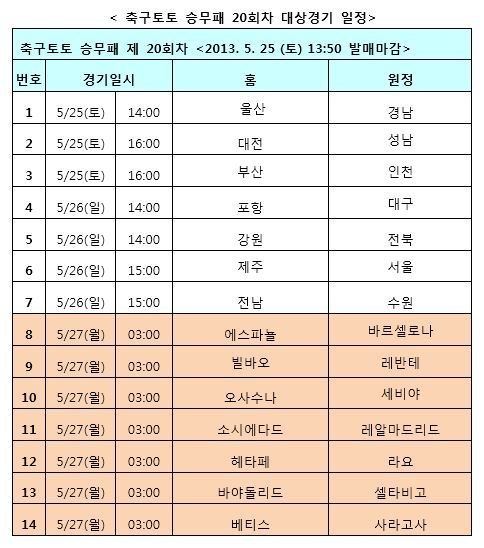 국민체육진흥공단(www.kspo.or.kr)이 발행하는 체육진흥투표권 수탁사업자인 스포츠토토(www.sportstoto.co.kr)는 오는 25일(토)부터 27일(월)까지 벌어지는 K리그 클래식 7경기 및 스페인 프리메라리가 7경기 등 총 14경기를 대상으로 한 축구토토 승무패 20회차 게임을 발행한다고 밝혔다.