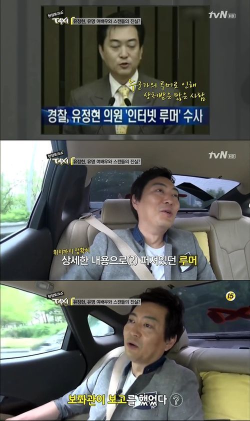 유정현은 21일 방송된 tvN ‘현장토크쇼 택시’에서 2010년 6월 불거진 유명 여배우와의 스캔들에 대해 해명에 나섰다. 그는 “지방선거 직전에 퍼진 스캔들”이라면서 “이상한 루머가 돌고 있다는 지인의 문자를 받았다. 나와 여배우가 양화대교 북단에 있는 모텔에 들락거린다는 루머였다”고 털어놨다.