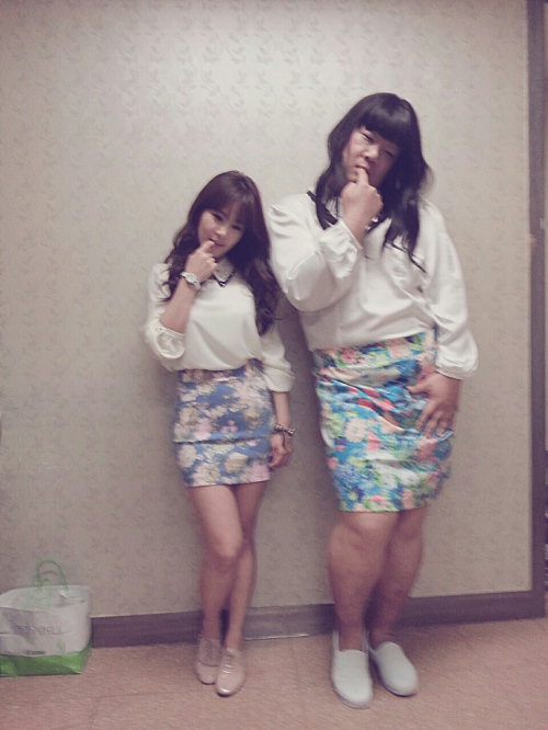 사진 속 김지민과 유민상은 하얀색 블라우스에 화사한 꽃무늬 치마를 입고 있다. 머리 스타일 조차 같은 두 사람은 그럼에도 전혀 다른 느낌을 주고 있어 웃음을 자아낸다.