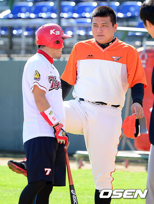 21일 오후 광주 무등야구장에서 열린 '2013 한국야쿠르트 세븐 프로야구' KIA 타이거즈와 한화 이글스의 경기, 경기에 앞서 한화 김태균이 KIA 이용규에게 장난을 치고 있다.