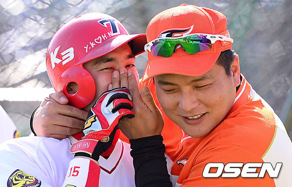 21일 오후 광주 무등야구장에서 열린 '2013 한국야쿠르트 세븐 프로야구' KIA 타이거즈와 한화 이글스의 경기, 경기에 앞서 한화 김태균이 KIA 이용규와 장난을 치고 있다.