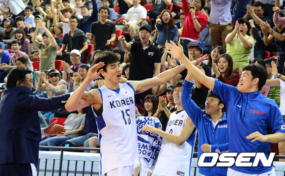 21일 오후 인천 삼산월드체육관에서 열린 '제3회 동아시아농구선수권대회(EABA)' 한국과 중국의 결승전, 4쿼터 한국 김종규가 슛을 성공시키고 최부영 감독과 기뻐하고 있다.