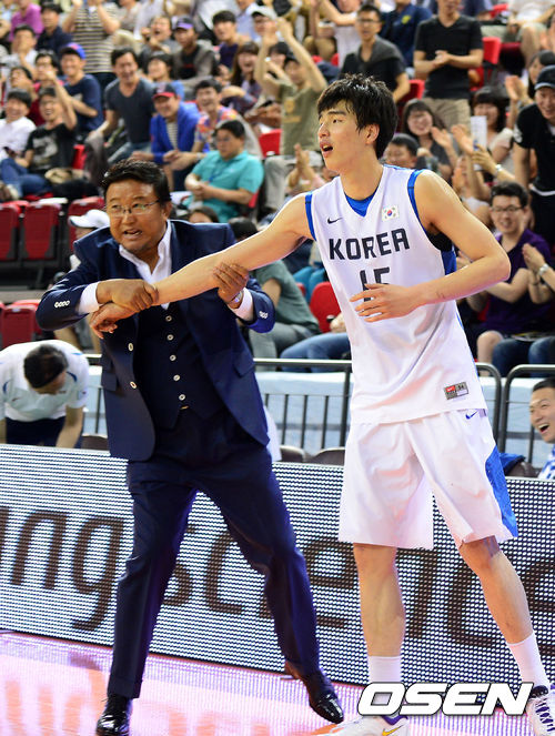 21일 오후 인천 삼산월드체육관에서 열린 '제3회 동아시아농구선수권대회(EABA)' 한국과 중국의 결승전, 4쿼터 한국 김종규가 슛을 성공시키고 최부영 감독과 기뻐하고 있다.