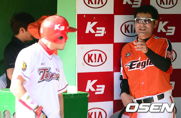 21일 오후 광주 무등야구장에서 열린 '2013 한국야쿠르트 세븐 프로야구' KIA 타이거즈와 한화 이글스의 경기, 경기에 앞서 KIA 이용규가 한화 이종범 코치와 이야기를 나누고 있다.