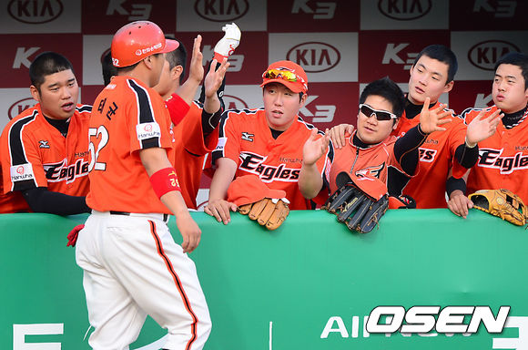21일 오후 광주 무등야구장에서 열린 '2013 한국야쿠르트 세븐 프로야구' KIA 타이거즈와 한화 이글스의 경기, 2회초 1사 만루에서 한화 조정원의 우전 적시타 때 홈을 밟은 3루주자 김태균이 덕아웃에서 동료들의 축하를 받고 있다.