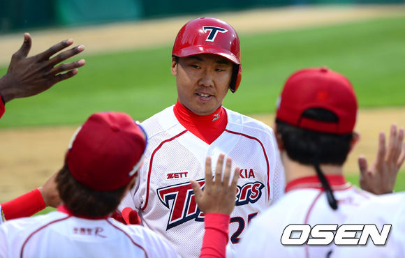 21일 오후 광주 무등야구장에서 열린 '2013 한국야쿠르트 세븐 프로야구' KIA 타이거즈와 한화 이글스의 경기, 3회말 2사 1루에서 KIA 이범호가 좌월 투런 홈런을 치고 덕아웃에서 동료들의 축하를 받고 있다.