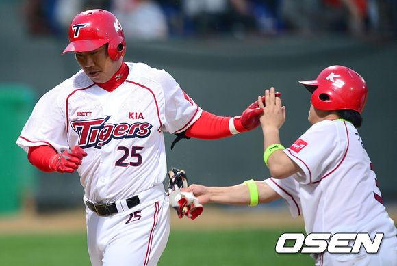 21일 오후 광주 무등야구장에서 열린 '2013 한국야쿠르트 세븐 프로야구' KIA 타이거즈와 한화 이글스의 경기, 3회말 2사 1루에서 KIA 이범호가 좌월 투런 홈런을 치고 김선빈과 하이파이브를 하고 있다.